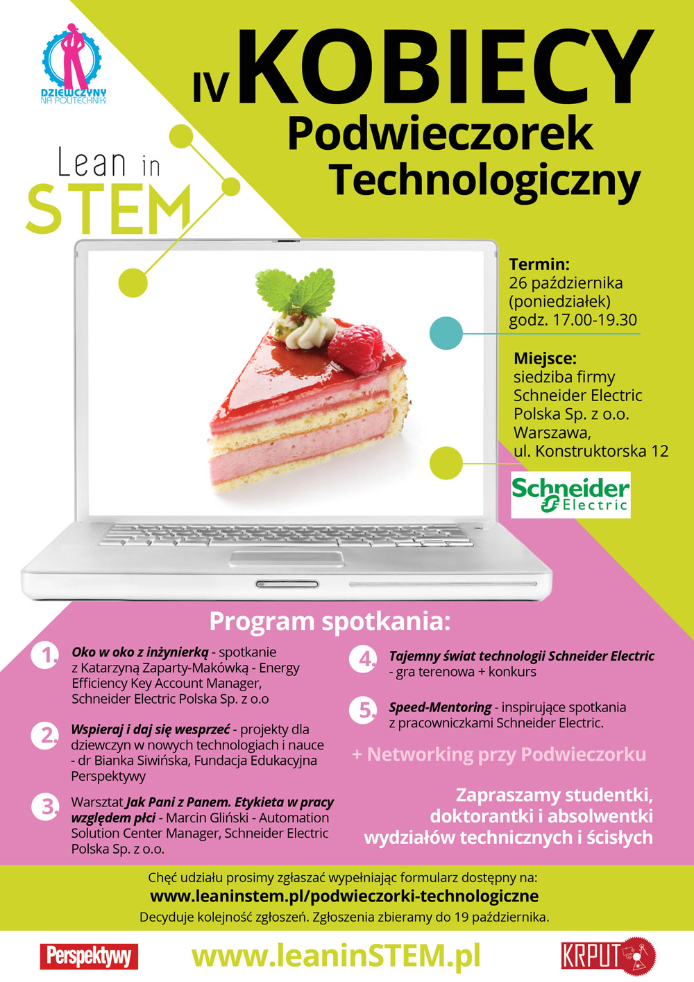 26 października odbył się IV Kobiecy Podwieczorek Technologiczny w firmie Schneider Electric. Powieczorek był doskonałą okazją do poznania tajemnego świata technologii firmy jak i do udziału w kobiecym speed-mentoringu. Studentki i doktorantki uczelni technicznych miały okazję na spotkanie oko w oko z inżynierką – Katarzyną Zapaty-Makówką – Efficiency Key Account Manager. Wzięły udział w warsztacie Jak Pani z Panem – Etykieta w pracy względem płci oraz w technologicznej grze terenowej z nagrodami. Było smacznie i inspirująco!