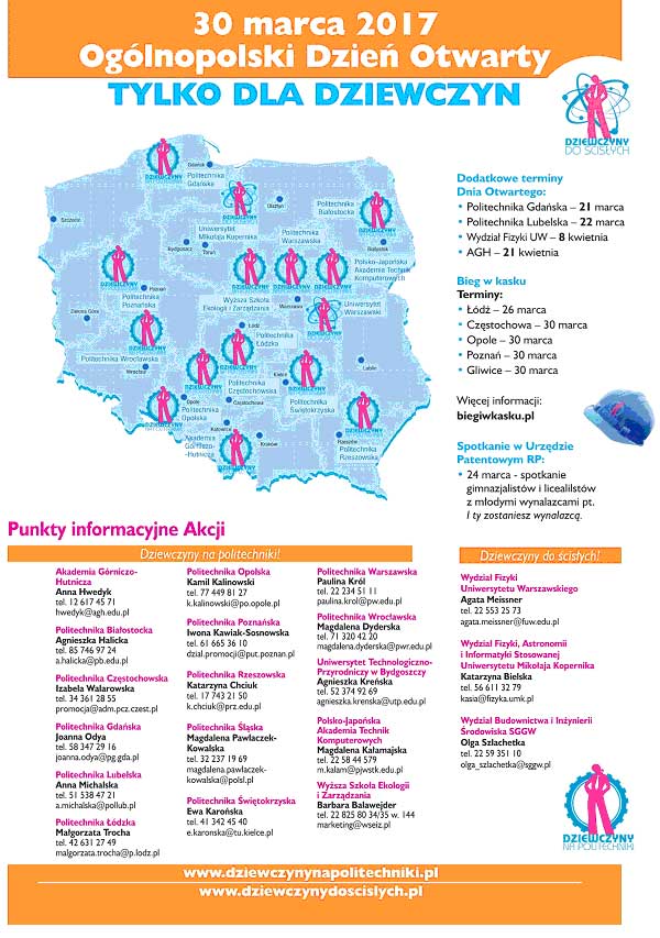 30 marca br. już po raz dziesiąty uczelnie techniczne zapraszają uczennice szkół ponadgimnazjalnych na specjalnie przygotowany dla nich Ogólnopolski Dzień Otwarty Dla Dziewczyn. Po raz ósmy zrobią to wydziały ścisłe uniwersytetów. Cel? Przekonać dziewczyny, że studia na kierunkach technicznych i ścisłych są dla nich doskonałym pomysłem na życie.
